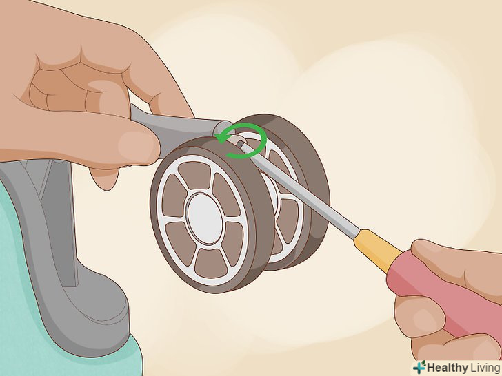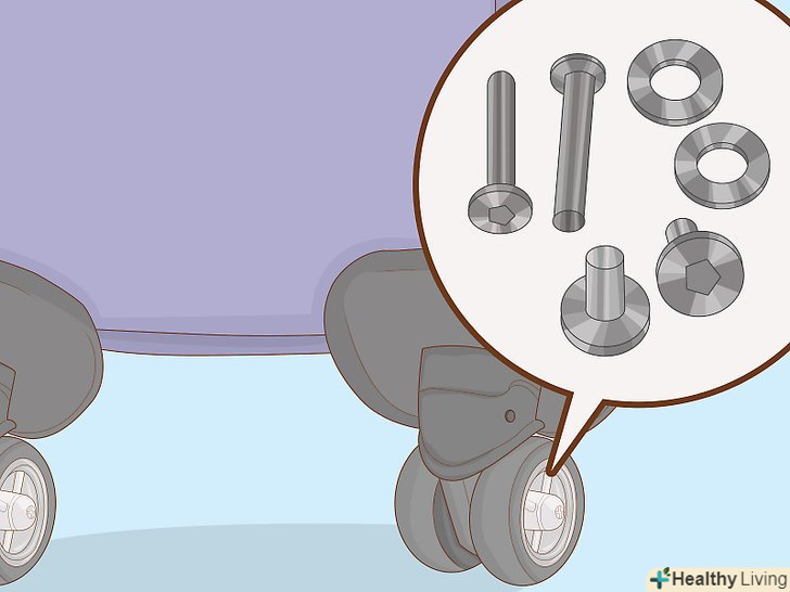 Викрутіть гвинти, що кріплять колесо. знайдіть місця кріплення гвинтів. За допомогою викрутки викрутіть гвинти. Не викидайте їх, якщо шліци не пошкоджені. У комплекті з коліщатком, яке ви купили, повинні бути гвинти, але старі теж можуть вам стати в нагоді. [5]