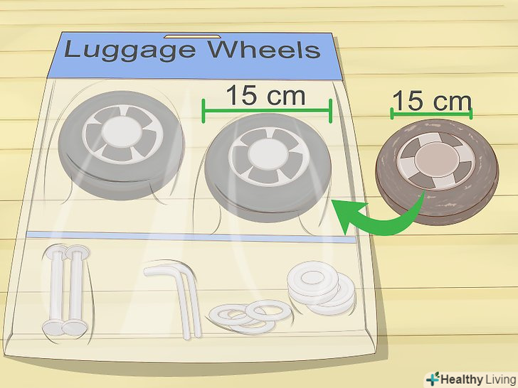 Купуйте коліщатко того ж діаметру і виробництва, що і старе коліщатко. для заміни найкраще підходять деталі аналогічного розміру, вироблені тією ж фірмою. Якщо ви не знаєте конкретну модель валізи, зв'яжіться з виробником.- Якщо ви купите коліщатко невідповідного розміру, швидше за все, його не вийде встановити, а якщо і вийде, то валіза буде котитися нерівно через різних розмірів коліс.