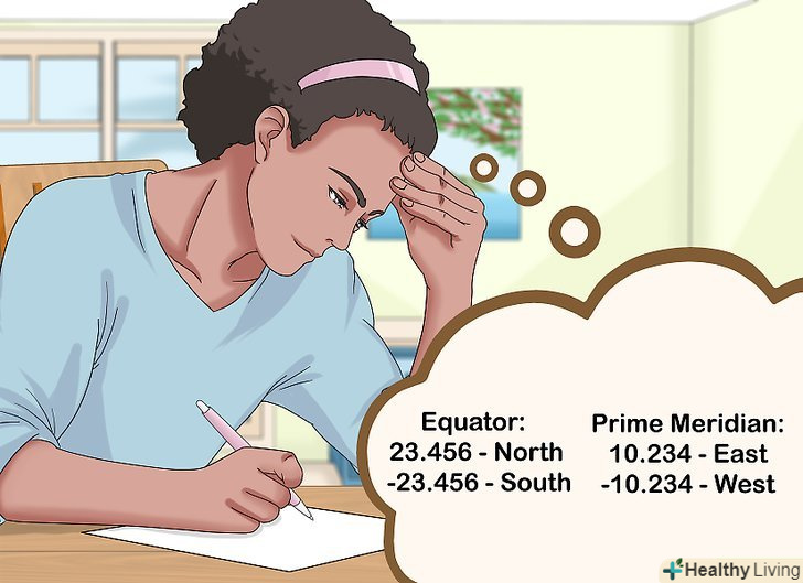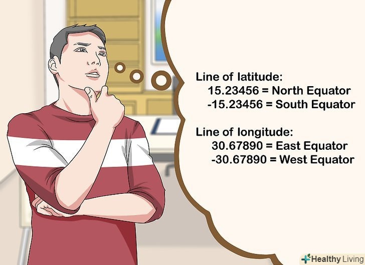 Визначте, чи є значення позитивними або негативними. замість слів «північ», «південь», «схід» і «захід» для позначення напрямку використовуються позитивні або негативні числа. Для паралелей: значення ліній, які лежать на північ від екватора-позитивні, і лінії на південь від екватора — негативні. Для меридіанів: лінії на схід від нульового меридіана-позитивні, і на захід від нього — негативні. [14]- Наприклад, широта 15,23456 буде на північ від екватора, а широта -15,23456 — на південь.