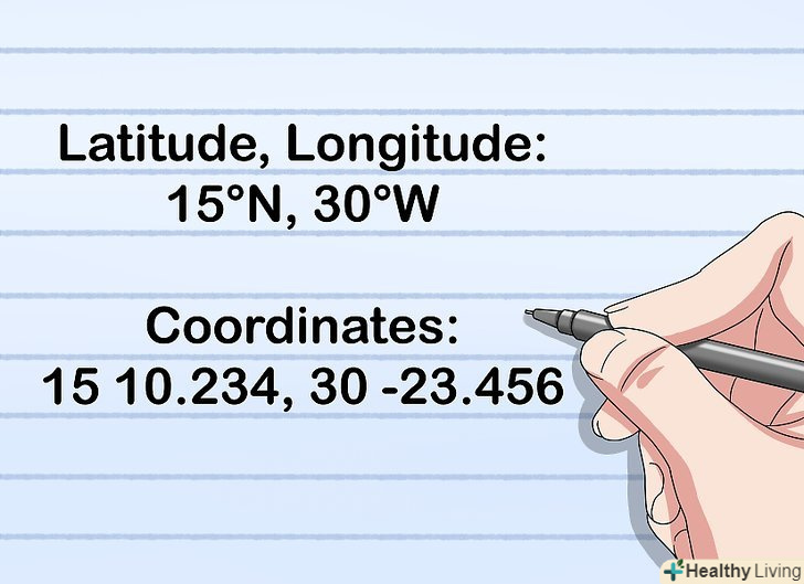 Запишіть широту і довготу. щоб записати координати, почніть зі значення широти. Запишіть його хвилинами з десятими частками. Потім запишіть хвилинами з десятими частками значення довготи (при міжнародному позначенні широта і довгота поділяються комою). Не забувайте використовувати позитивні і негативні значення для позначення напрямку. У цьому форматі значок градуса не ставиться. [11]- Наприклад, лінія розташовується на 15° С. ш.30° в. д. (15°N, 30°W). Визначте хвилини і десяті частки і запишіть координати.