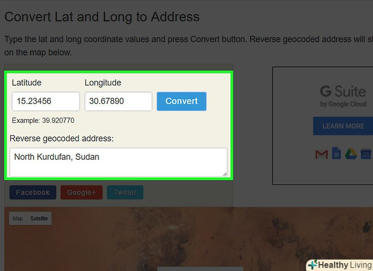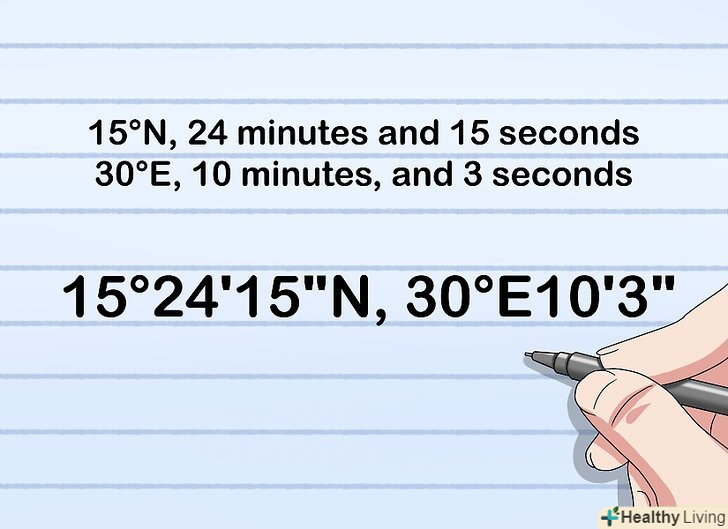 Запишіть градуси, потім хвилини і в кінці секунди. коли ви визначите точні координати широти і довготи з хвилинами і секундами, запишіть їх в правильному порядку. Почніть з широти: запишіть градуси, хвилини і секунди. Потім додайте» с. ш. «або» ю. ш. " для вказівки півкулі. Потім запишіть довготу (при міжнародному позначенні — відокремте Коми): градуси, хвилини і секунди. Потім додайте "в. д." або» з. д. " для вказівки розташування щодо Гринвіча. [7]- Наприклад, припустимо, що є широта з координатами 15° С. ш., 24 хвилини і 15 секунд. І довгота 30° В. Д., 10 хвилин і 3 секунди.