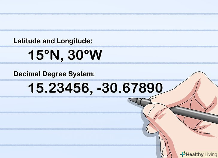Запишіть широту і довготу, включаючи десяті частки. десяткові градуси дуже легко використовувати. Просто запишіть широту з десятими частками, а за нею — довготу з десятими частками. Використовуйте позитивні або негативні числа для вказівки напрямку. [15]- Наприклад, координати 15° С. ш. 30° з. д. в системі десяткових градусів можна записати як15,23456, -30,67890 .