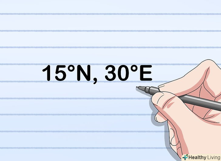 Визначте координати широти і довготи точки. можна використовувати хвилини з десятими частками для позначення широти і довготи. Але все одно спочатку потрібно визначити потрібні паралель і меридіан. З'ясуйте, де перетинаються паралель і меридіан, щоб точно визначити ваше місце розташування. [8]- Наприклад, ваше місце розташування 15° С. ш. 30° з. д.