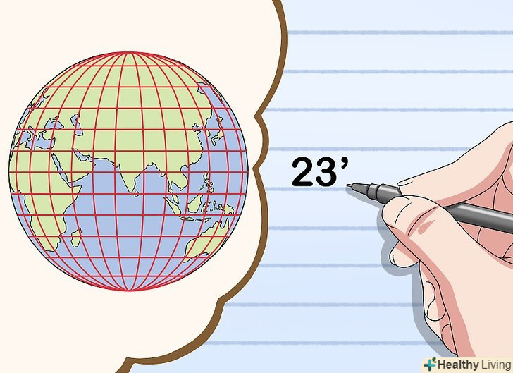 Визначте хвилини між паралелями і меридіанами. відстань між двома паралелями і двома меридіанами дорівнює 1 градусу. Цей градус можна розділити на хвилини. Уявіть, що існує 60 однакових хвилин, що розділяють сусідні паралелі і меридіани. Можна знайти онлайн-карту, яка допоможе визначити точне значення хвилин для обраного місця. Для позначення хвилин використовується одинарний штрих (схожий на апостроф). [5]- Наприклад, якщо потрібно позначити 23 хвилини між паралелями, то вони записуються так:23' .