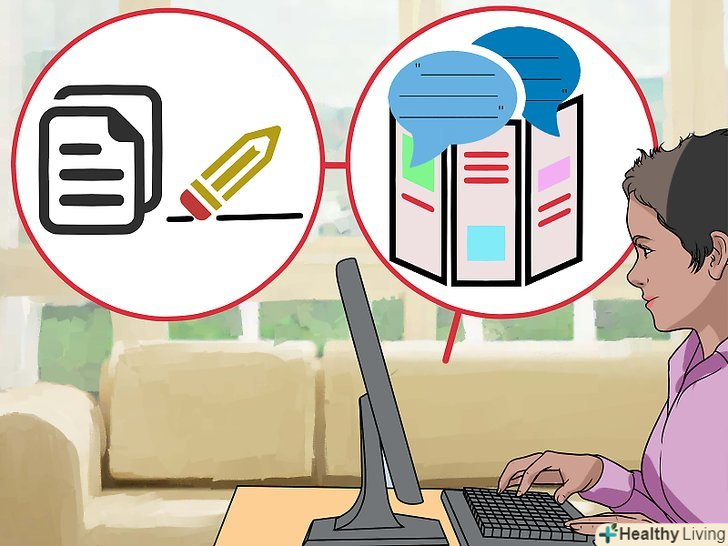 Використовуйте спеціальні шрифти. Брошура повинна бути легко-і легко читається. Текст брошури повинен бути послідовним, щоб не викликати ніякого замішання у читача. [3]- Заголовок брошури повинен бути написаний жирним підкресленим шрифтом досить великого розміру, щоб його можна було розібрати з деякої відстані. Якщо потенційний клієнт буде чекати своєї черги в клініці або сидіти в кав'ярні, у нього повинна бути можливість ясно розгледіти заголовок у верхній частині вашої рекламної брошури.