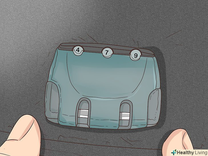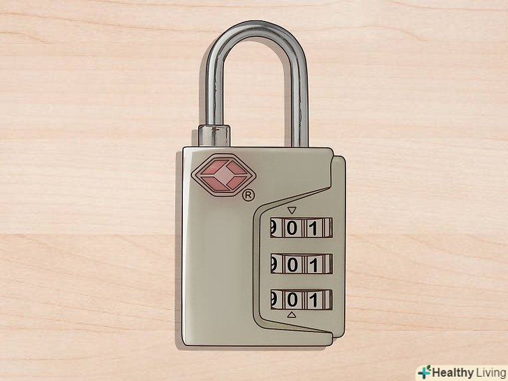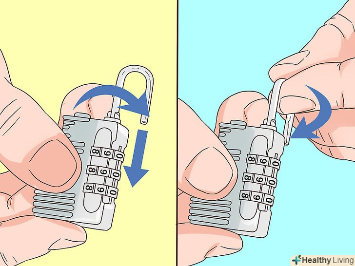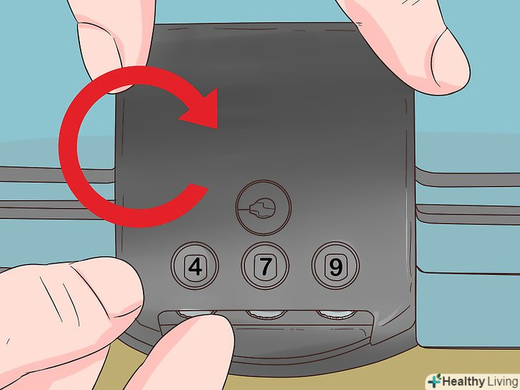 Закрийте замок, виставивши випадкове число. поверніть важіль у перше положення. Виставивши на коліщатках випадкові числа, переконайтеся, що ви закрили замок, а потім введіть правильну комбінацію, щоб перевірити, чи не відкриється замок. Якщо замок відкриється, знову виставте на ньому випадкові числа, щоб закрити валізу. [8]