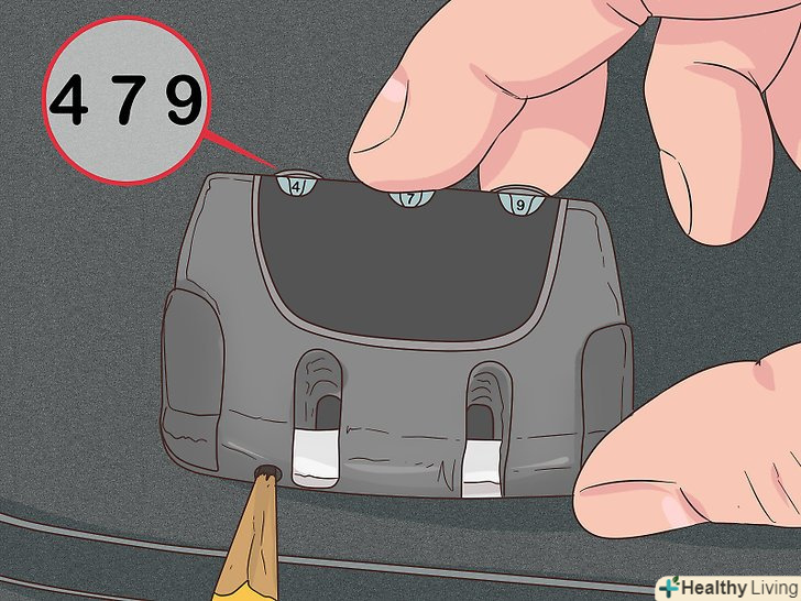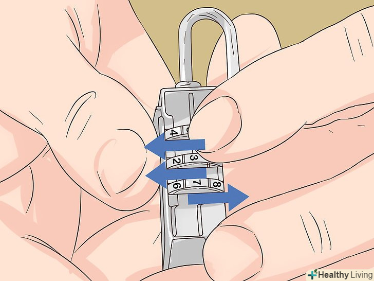 Змініть комбінацію. введіть в замок нову комбінацію. Придумайте комбінацію, яку легко запам'ятати, і виставте її на замку. Поверніть кожне коліщатко до необхідної цифри. [7]