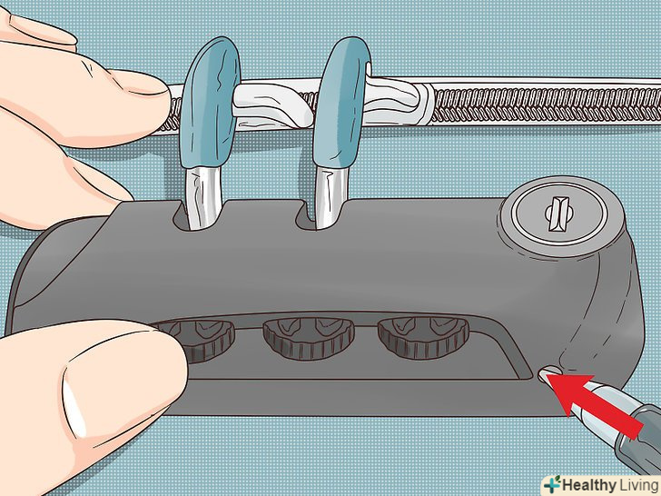 Поверніть дужку на 90 градусів і натисніть на неї вниз. ступінь повороту і натиску буде залежати від самого замку. Для початку поверніть її на 90 градусів від початкового положення. Натисніть на дужку і поверніть її на 180 градусів від початкового положення. [10]- Якщо комбінація не буде скинута, спробуйте спочатку повернути дужку на 180 градусів, натиснути на її, а потім повернути на 90 градусів у зворотний бік. Ви не дізнаєтеся, чи призвело це до скидання комбінації, поки не введете новий код і не спробуєте відкрити їм замок. [11]