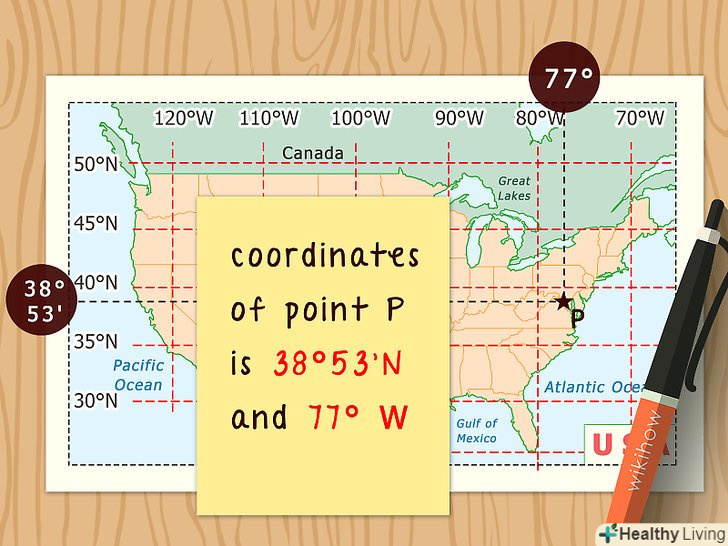 Визначте широту і довготу цікавить Вас точки, використовуючи підписи широт і довгот. в залежності від масштабу карти, ви зможете визначити координати цікавить Вас точки до градусів, хвилин або секунд. Подивіться на місце, де намальовані вами лінії широти і довготи перетинають край карти, і визначте їх координати по їх положенню щодо найближчих ліній, наявних на карті.- Якщо на використовуваній вами карті показані секунди, знайдіть позначку секунди, найближчу до того місця, де нанесена вами лінія перетинає край карти. Наприклад, якщо лінія знаходиться приблизно в 5 "вище лінії 32°20' пн. ш., потрібна точка має широту приблизно 32°20'5" пн. ш.