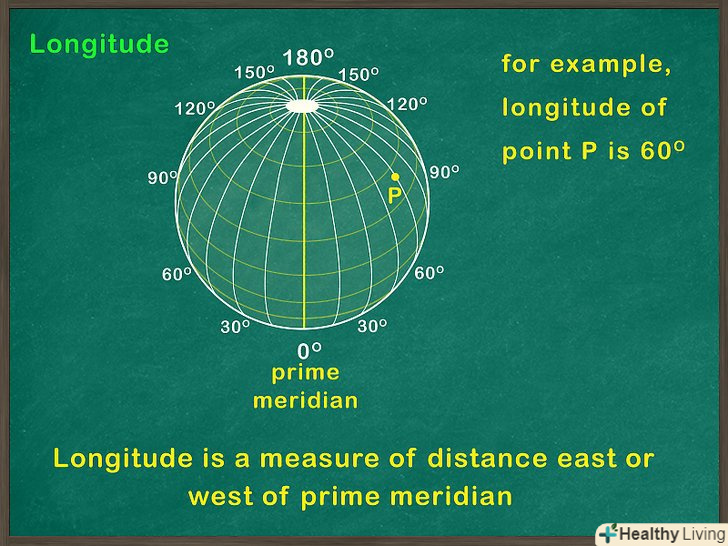Дізнайтеся визначення довготи. довгота-це міра відстані на схід або захід від уявної лінії, що проходить по поверхні земної кулі від Північного полюса до Південного, званої нульовим меридіаном. Лінії довготи-це серія ліній, що йдуть від Північного полюса до Південного, які називаються меридіанами; на картах вони зазвичай вертикальні. У всіх точках, через які проходить один Меридіан, полудень настає в один і той же час. На Землі 360 меридіанів, з яких 180 розташовані на схід від нульового меридіана, а інші 180 — на захід. [2]- Меридіан на протилежній стороні Землі відносно нульового меридіана називається антимеридіаном. [3]