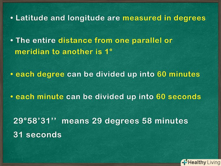 Вивчіть одиниці виміру широти і довготи. Широта і довгота зазвичай вимірюються в градусах ( ° ), хвилинах ( ' ), і секундах ("). Повна відстань від однієї паралелі до іншої або від одного меридіана до іншого становить 1°. Щоб виробляти більш точні вимірювання, кожен градус можна розділити на 60 хвилин, а кожну хвилину - на 60 секунд (таким чином, в градусі буде 3600 секунд). [4]- Широта і довгота вимірюються в градусах, а не в абсолютних одиницях вимірювання довжини (наприклад в кілометрах), тому що Земля має форму кулі. У той час як відстань між градусами широти постійно (60 морських миль або 111,12 км), відстань між градусами довготи зменшується в міру наближення до полюсів через форму Землі. [5]
