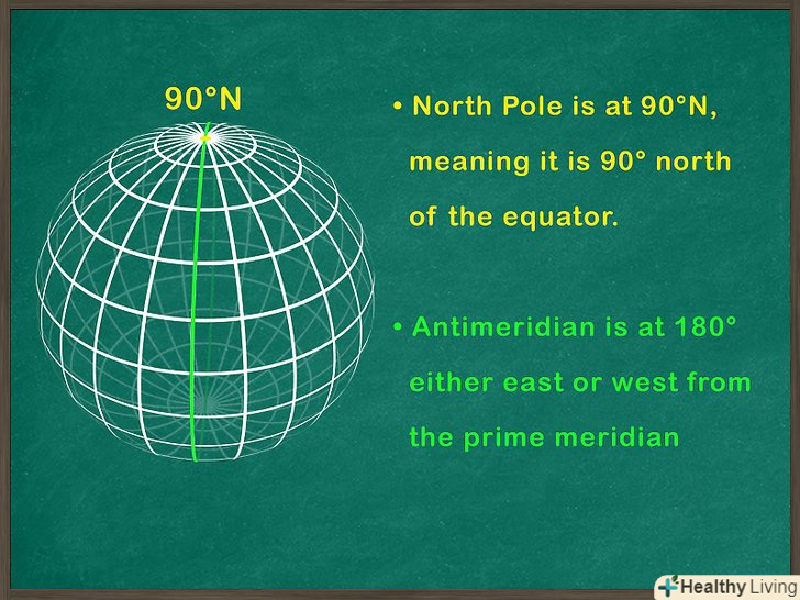 Виміряйте широту і довготу щодо нульової точки. при вимірюванні широти в якості початкової лінії розглядається екватор, який має широту 0°. Аналогічно нульовий меридіан є початковою лінією для вимірювання довготи, маючи довготу 0°. Будь-яке значення широти або довготи виражено тим, наскільки далеко дана точка від початкової лінії і в якому напрямку від неї Вона знаходиться. [6]- Наприклад, широта Північного полюса 90° С. ш. (північної широти), що означає, що він знаходиться в 90° на північ від екватора.