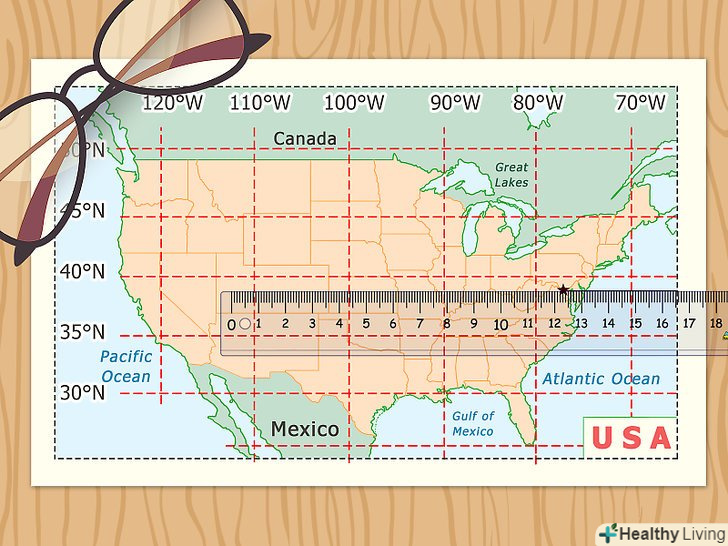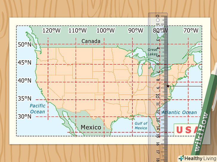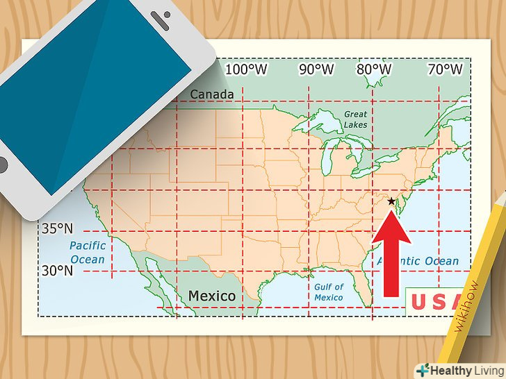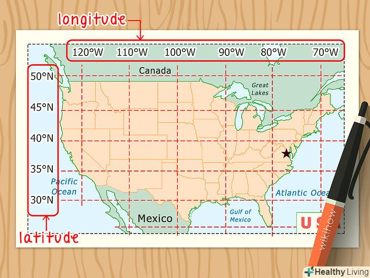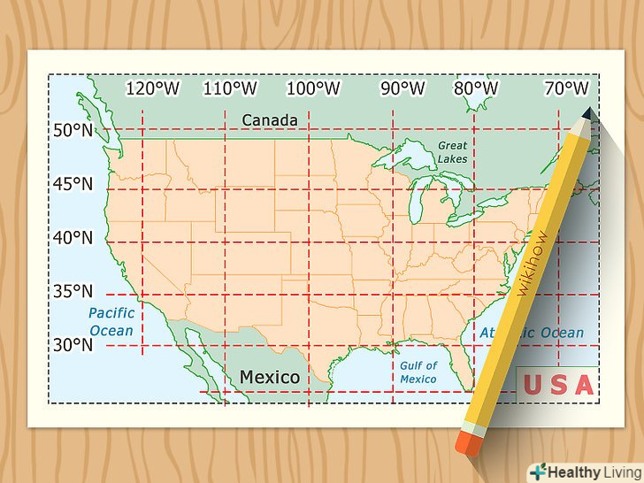 Знайдіть позначки широти і довготи на карті. Широта позначається на карті серією горизонтальних ліній з однаковою відстанню між ними, що йдуть від однієї сторони карти до іншої, а довгота — серією вертикальних ліній з однаковою відстанню між ними, що йдуть зверху вниз. Подивіться на числа вздовж країв карти - вони показують координату (широту або довготу) для кожної лінії. [7]- Широти Показані уздовж Східної і Західної кордонів карти. Довготи Показані вздовж її північної і Південної кордонів.