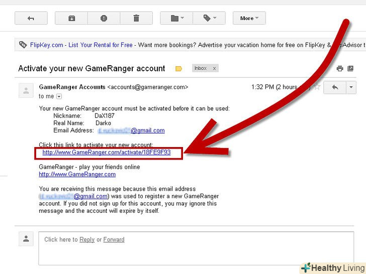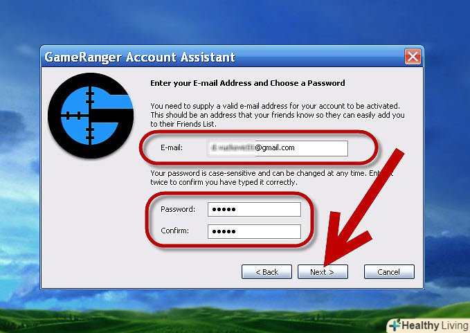 Підтвердіть адресу електронної пошти вашого облікового запису.як тільки ви створите аккаунт, GameRanger надішле Вам лист на електронну пошту, яку ви ввели при реєстрації. Натисніть на посилання, яке дається в листі, щоб активізувати ваш аккаунт, перед тим як ви натиснете на "Continue" (Продовжити) у вікні GameRanger. Як тільки ви натиснете на посилання підтвердження, затисніть «Next» (Далі), щоб зайти в GameRanger.