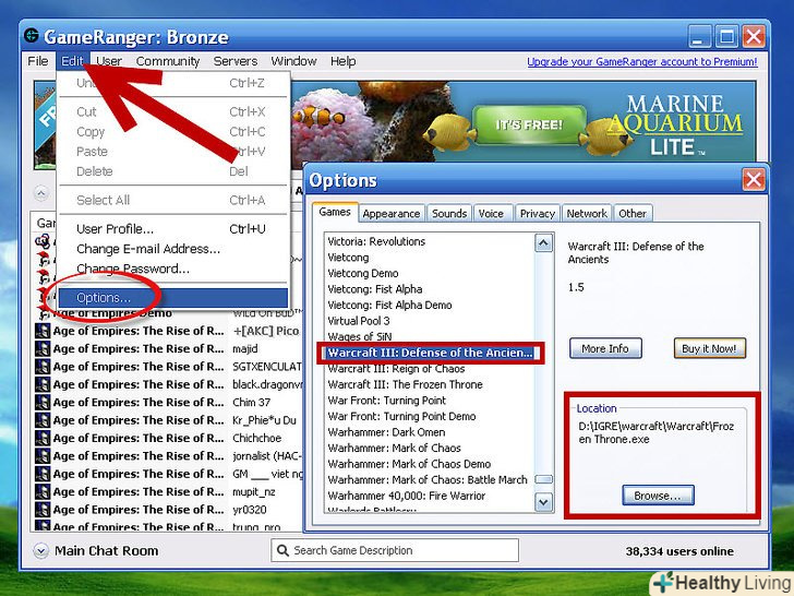 Додайте файли гри Warcraft 3.щоб ви могли зайти в гру, вам потрібно буде вказати GameRanger, куди встановлена гра Warcraft 3. Клацніть по меню "Edit «і виберіть»Options". У закладці гри перегорніть вниз, поки ви не знайдете Warcraft 3. У секції "Location" клацніть по "Browse", і знайдіть місце, де встановлена гра Warcraft 3.