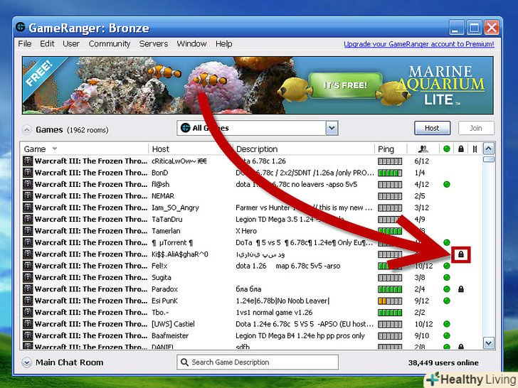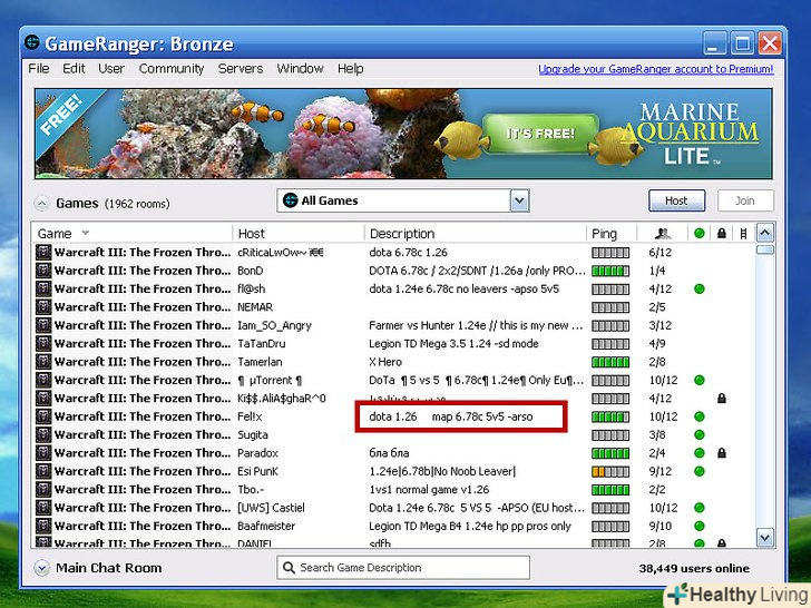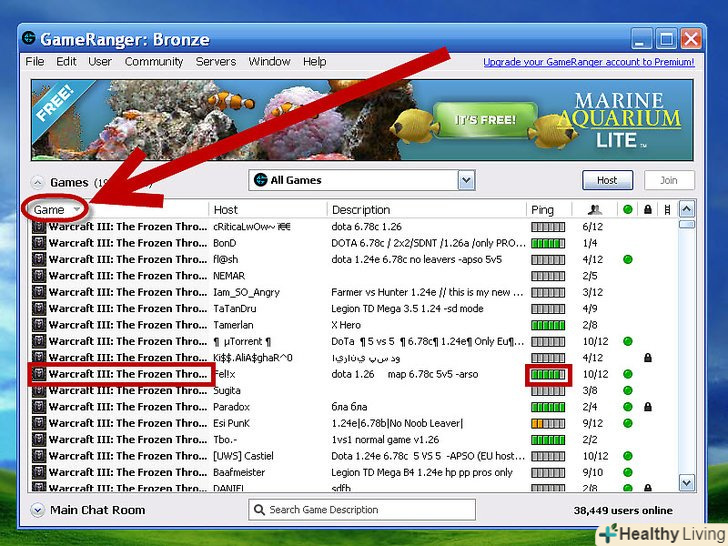 Знайдіть гру. у головному списку гри або прокрутіть вниз до Warcraft 3, або виберіть «My Games» (мої ігри) зі спадного меню, і виберіть гру Warcraft 3. Кожна показана гра буде у вигляді лобі, яке запустив інший гравець. Знайдіть гру з повним пінгом і зеленою лампочкою. Зелена лампочка означає, що ви можете приєднатися до гри.- Опис гри скаже, яку версію гри Warcraft вам потрібно буде мати. Більшість використовують останній патч.