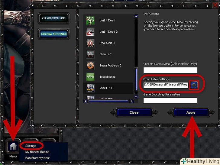 Конфігуруйте файли гри.клацніть по кнопці "Menu" в лівому, нижньому кутку браузера гри. Виберіть " Settings "(Налаштування) з меню. У вкладці "Game Settings" (Налаштування гри), прокрутіть вниз, поки ви не знайдете Warcraft 3. Переконайтеся, що виконуючий файл налаштований правильно в поле " Executable Settings "(Налаштування испольнения). Клацніть по значку з шестерінкою, щоб подивитися файли Warcraft 3.