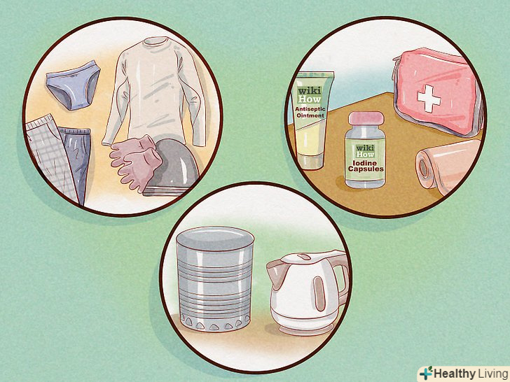 Безпечне укриття, вода і тепло в першу чергу. Ви повинні переконатися, що у вас є всі предмети першої необхідності. В першу чергу ви повинні подбати про те, щоб не замерзнути вночі, не відчувати спрагу вдень, а також, якщо буде необхідно, сховатися від негоди.- Якщо ви подорожуєте на далекі відстані, вашим пріоритетом повинна бути вода. У вас повинен бути достатній запас питної води, або ж Ви повинні мати пристрій для її фільтрації. Все інше має відійти на другий план.