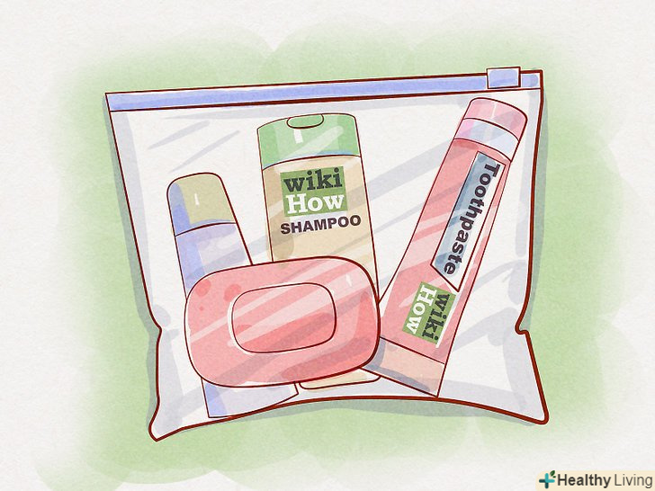 Використовуйте пакети для дрібних речей. завдяки цьому вам буде легше дістати їх при необхідності. Також використовуйте пакети для продуктів харчування, пляшок з водою та іншими рідинами.- Мило, шампунь, зубну пасту та інші туалетні приналежності покладіть в один пакет, щоб ви могли легко їх дістати. Крім того ваші речі залишаться чистими, якщо щось розіллється на них.