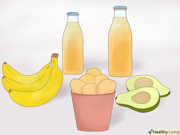 Їжте їжу, багату калієм. крім зневоднення, діарея призводить також до підвищених втрат калію. Щоб компенсувати ці втрати, слід включити в свій раціон багаті калієм продукти, такі як банани (пам'ятайте про те, що їх слід чистити самостійно), Бутильовані фруктові соки і як слід приготований картопля. [32]