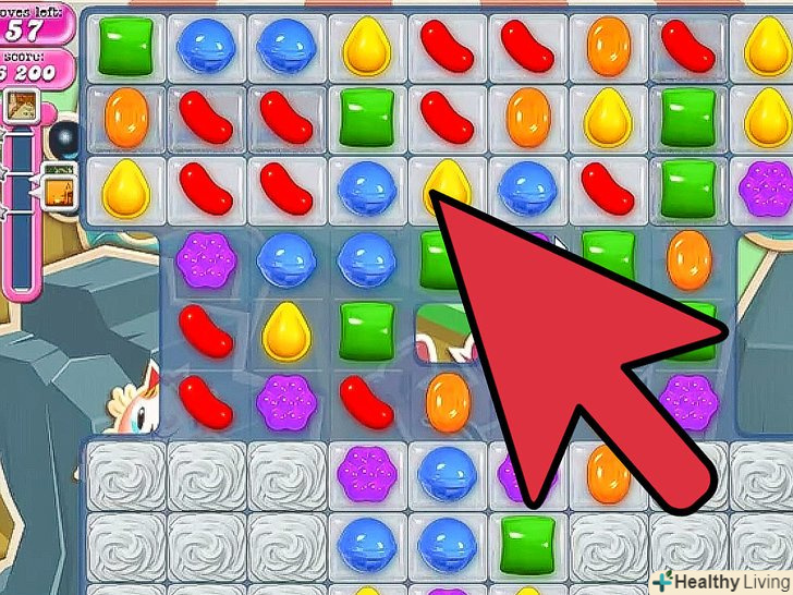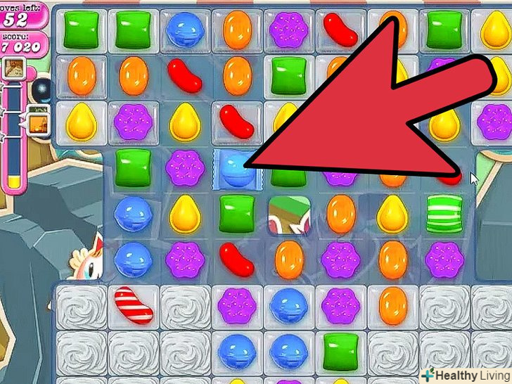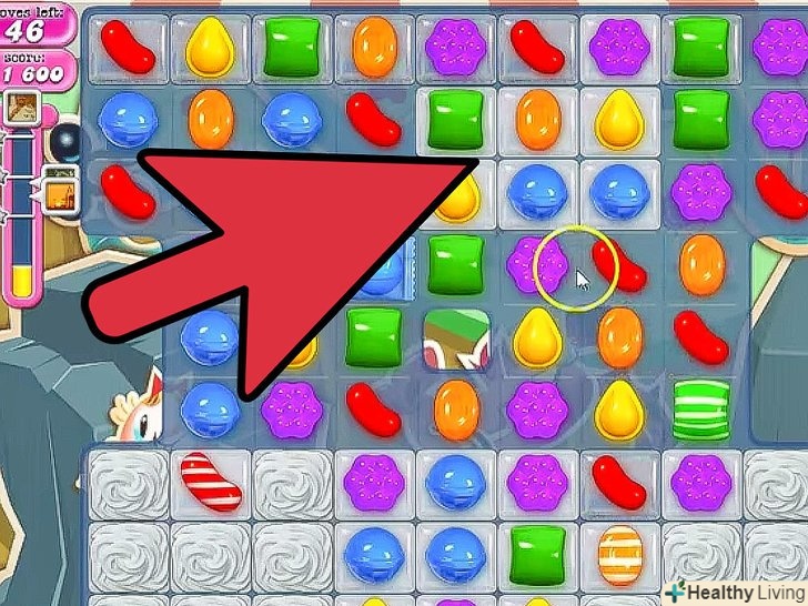 Стратегічно використовуйте смугасті цукерки.не використовуйте їх відразу ж після отримання. Зачекайте відповідного моменту. Пам'ятайте, що використовувати їх треба максимально ефективно, щоб позбутися від якомога більшої кількості желе.- Подивіться на знімок, викладений внизу. Цукерка в червону смужку вже знаходиться в хорошій позиції, але цукерка в фіолетову смужку знаходиться не в дуже відповідному місці, якщо ви її активізуєте, ви нічого корисного цим не досягнете. Ви просто даремно витратите цю особливу цукерку. Краще перемістити її ближче до нижнього краю дошки (або, якщо хочете, вгору, якщо там є цукерки того ж кольору).