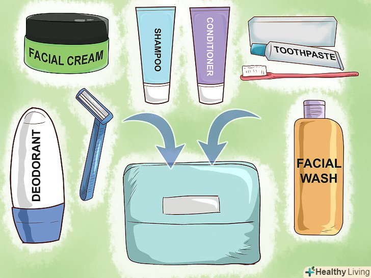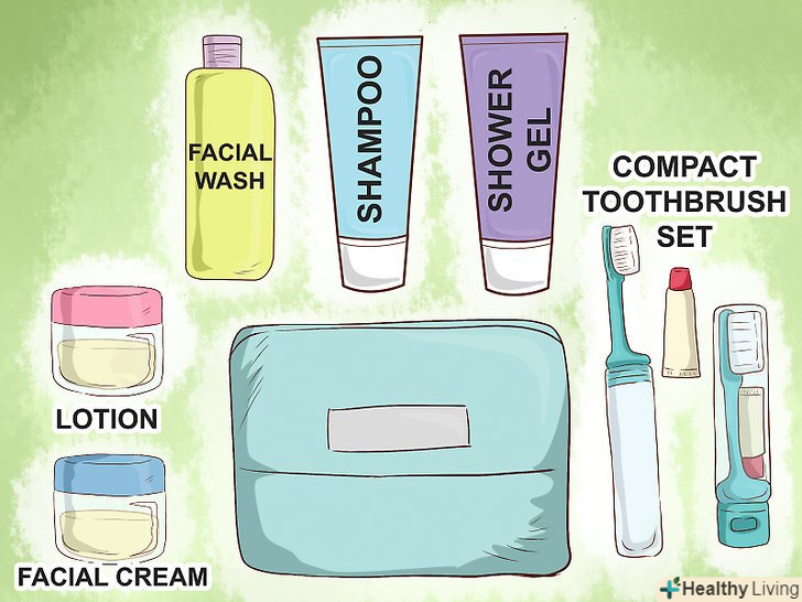Не забудьте взяти з собою в поїздку засоби особистої гігієни. Вам можуть знадобитися: дезодорант, зубна паста і щітка, шампунь і кондиціонер, гель для Душу, Лосьйон для обличчя, щітка для волосся і засоби для укладання, контейнер і розчин для контактних лінз, антисептик для рук, бритва і крем для гоління, прокладки, бальзам для губ. [5]- Постарайтеся купити всі необхідні засоби в маленьких упаковках. У парфумерних і господарських магазинах іноді продаються дорожні косметичні набори невеликого формату з усім необхідним. Ви також можете купити порожні дорожні флакони для косметичних засобів і наповнити їх самостійно. [6]