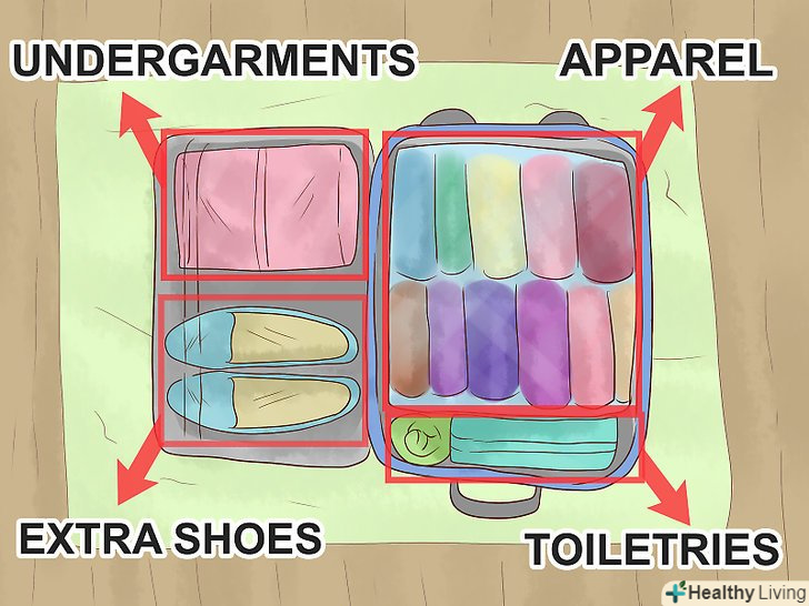 Все, що ви плануєте взяти з собою, має поміститися в одну сумку. Одяг та інші предмети, необхідні для п'ятиденного відпустки, повинні поміститися з одну сумку або валізу. Необхідність упакувати все в одну сумку допомагає зробити це більш організовано і економно.- Якщо ви пакуєте багаж відразу на кілька людей, постарайтеся розкласти речі різних людей на окремі купки, щоб не забути упакувати щось необхідне або важливе.