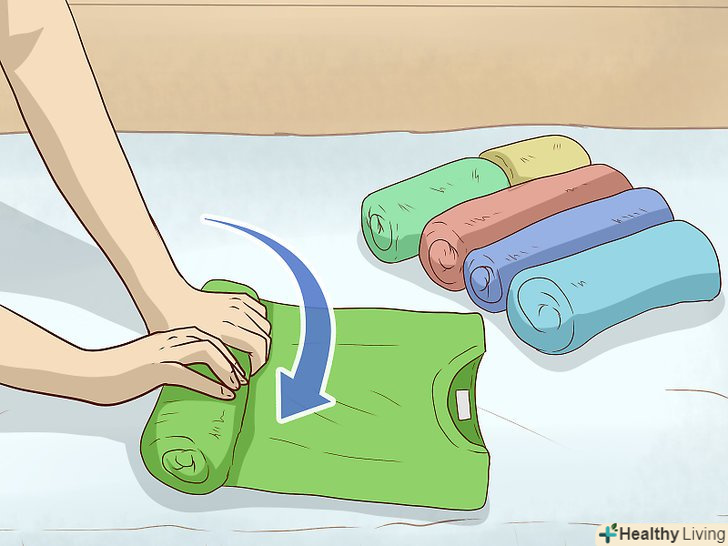 Щоб заощадити місце, згорніть одяг в рулони. одяг, згорнута в щільний рулон, не мнеться і займає менше місця у валізі. Поверніть речі наступним чином: розстеліть один предмет одягу на плоскій поверхні і відверніть нижній край (приблизно 5 см) виворітного стороною назовні. (Пізніше ви заправите отриманий рулон в цей конверт / кишеню). Почніть згортати одяг з протилежного кінця в щільний рулон, поки не дійдете до відвернутого краю. Заправте рулон в цей конверт. [15]- Шкарпетки і нижню білизну можна згорнути і покласти в черевики, щоб заощадити місце.