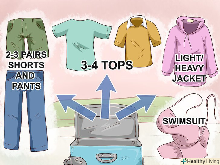 Візьміть з собою стільки одягу, щоб вам вистачило на тиждень. у п'ятиденну поїздку необхідно взяти: 2-3 пари шортів або штанів, 3-4 футболки або сорочки, легку куртку (або теплу куртку, в залежності від клімату і погоди) і одну зміну парадного одягу, якщо ви плануєте відвідування ресторану або якогось заходу. Якщо попереду Пляжний відпочинок, візьміть з собою кілька купальників або 2-3 пари плавок. [7]- Постарайтеся підібрати всі предмети одягу так, щоб все можна було комбінувати один з одним.
