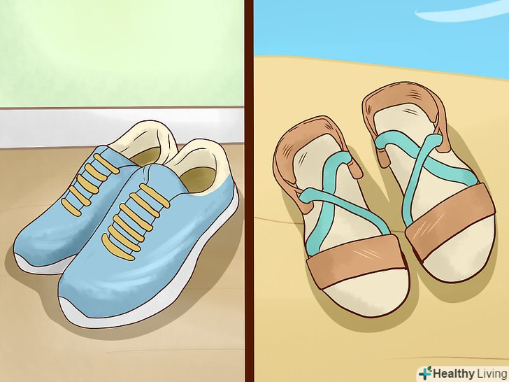 Ретельно продумайте, яке взуття необхідно взяти з собою. вам знадобиться одна зручна пара взуття для піших прогулянок. Якщо ви плануєте вихід у світ, захопіть пару туфель на підборах або балетки. Для відвідування пляжу потрібні сандалі. Чим менше пар взуття ви візьмете з собою, тим легше буде багаж. [9]- Якщо плануються будь-які особливі види фізичної активності, наприклад сходження в гори або сплав на плотах, не забудьте взяти спеціальне взуття.