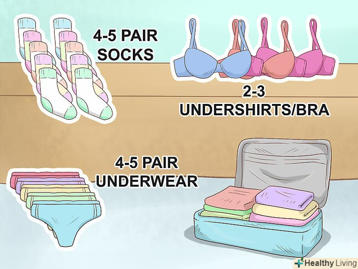 Упакуйте білизну. вам знадобиться 4-5 пар нижньої білизни, 4-5 пар шкарпеток, 2-3 нижніх майки або бюстгальтера, а також комбінація або будь-яке нестандартне білизна, яке вам може знадобитися (наприклад, бюстгальтер без бретелей під відкрите плаття). Якщо у вас не дуже багато місця в багажі, зменшіть кількість білизни-його можна буде випрати в раковині. [10]- У деяких готелях і апартаментах є пральні та сушильні машини, якими можуть користуватися постояльці.