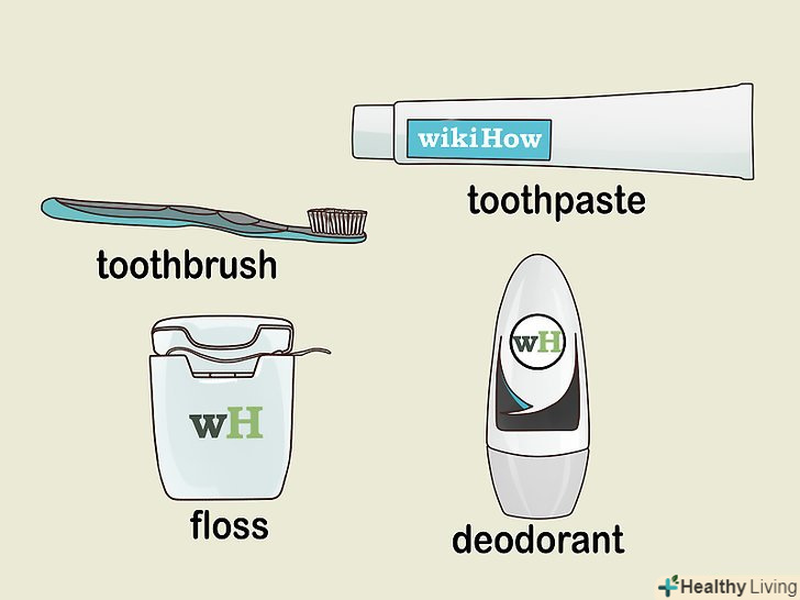 Складіть в сумку тільки найнеобхідніші туалетні приналежності. Обов'язково візьміть з собою зубну щітку, зубну пасту, зубну нитку і дезодорант. Якщо ви будете наносити макіяж, візьміть з собою Серветки для зняття макіяжу і своє звичайне миючий засіб для обличчя. Уточніть у співробітників готелю, чи є в номері шампунь, кондиціонер для волосся і мило, або, якщо ви зупиняєтеся у одного, попросіть позичити вам деякі туалетні приналежності. [4]