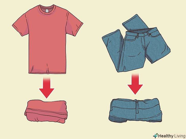 Згорніть або складіть джинси, сорочки та сукні. існує кілька варіантів упаковки одягу: можна згорнути її в рулон або скласти шарами на дні сумки. Спочатку покладіть важку куртку, якщо вона у вас є, а потім джинси, сукні і нарешті сорочки.