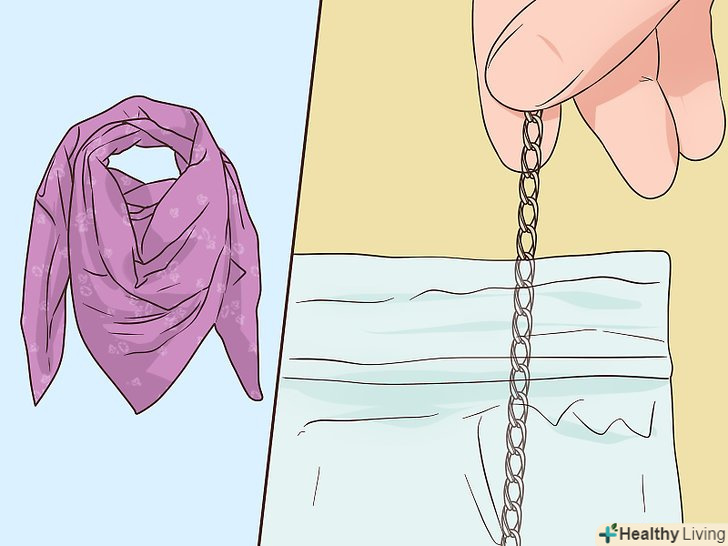 Візьміть кілька аксесуарів. Ювелірні вироби легше і менше, ніж одяг, і за допомогою них можна перетворити простий наряд в одну мить. Якщо ви будете перебувати в прохолодному кліматі, візьміть шарф, або надіньте його в дорогу. [3]- Щоб ланцюжок не сплуталася, помістіть її в пластиковий пакет і вийміть назовні невелику частину. Щільно застебніть пакет навколо цієї частини ланцюжка, але залиште її стирчить зверху.