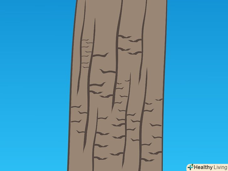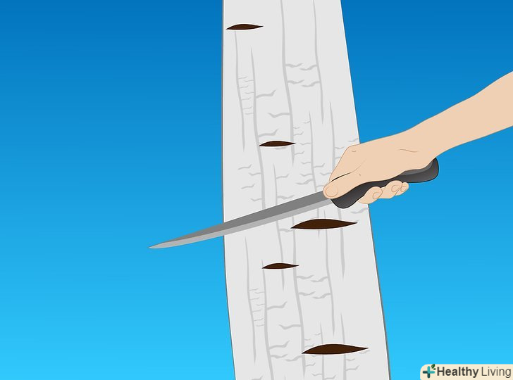 - За допомогою ножа проріжте горизонтальну смужку по всьому колу стовбура. Одну зніміть біля коріння, а другу — близько метра вище першої.