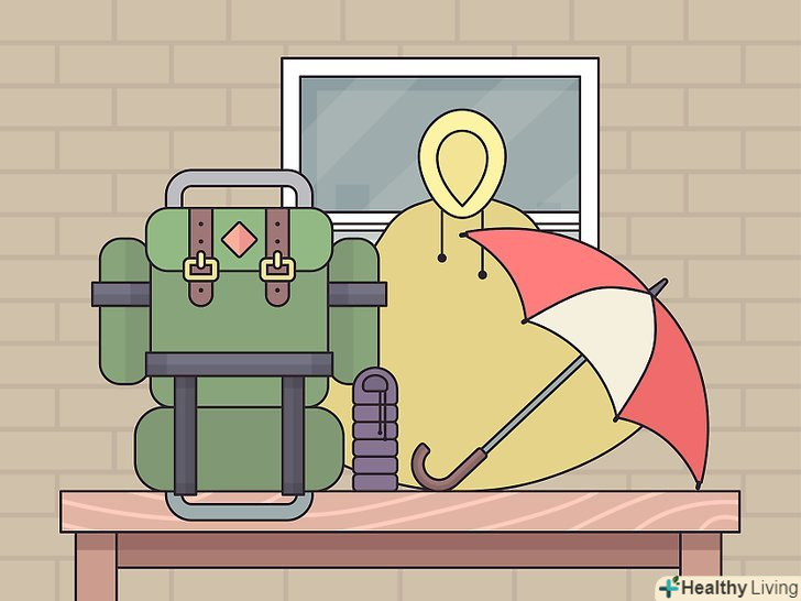 Не обов'язково займати цінний простір валізи дощовиком. дізнайтеся прогноз погоди в місцях подорожі до того, як упаковувати такі речі. Якщо тільки ви не збираєтеся кудись, де виключно дощова погода, наприклад в Таїланд в сезон дощів, прогноз погоди на час вашого двотижневого перебування повинен підказати вам, чи варто брати чоботи, дощовики і парасольки. Хоча ніщо не може зіпсувати вашу поїздку більше, ніж непідготовленість до зливу, ці предмети також займають значне місце, яке стане в нагоді для абсолютно необхідних речей. [15]- Візьміть з собою непромокальне взуття і куртку, які можна також носити і в суху погоду. Це означає, що ви не будете займати місце дощовиком, але все ж зможете погуляти, коли з неба закапає.