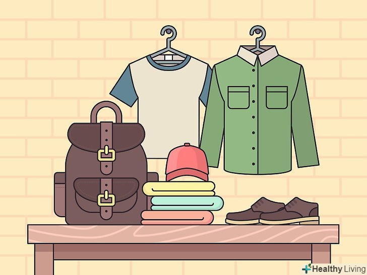 Упаковка "у трьох примірниках". підготуйте три пари шкарпеток, нижньої білизни і сорочок. Таким чином, у вас буде достатньо речей: один комплект в пранні, другий-сушиться, а третій ви носите. Штани зазвичай можна надягати кілька разів, так що двох пар повинно вистачити. Це стосується лише одягу, який ви будете носити кожен день. Якщо у вас в планах похід на захід, де ваш звичайний костюм недоречний, продумайте цей момент. [3]- Зокрема, якщо ви подорожуєте в теплу пору року, не забудьте взяти одяг з легких (наприклад, напівнатуральних) тканин, міцну і швидко сохне, яку нескладно упакувати.