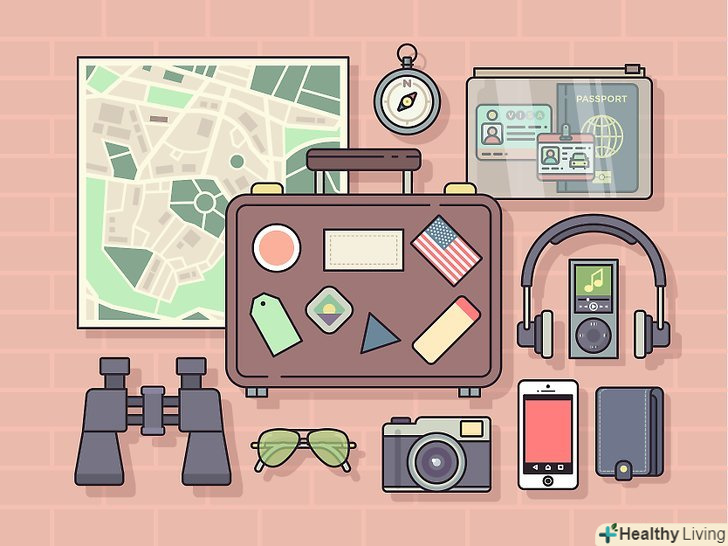 Спочатку упакуйте речі, без яких ви точно не зможете обійтися. хороша ідея — зберігати всі проїзні документи, візи та паспорти в спеціальній сумці або в косметичці, де вони не загубляться. Обов'язково візьміть з собою запаси ліків, які ви не зможете купити в дорозі, а також необхідні туалетні приналежності, які важко знайти там, куди ви їдете. Важливо взяти щоденник і фотоапарат — це допоможе зберегти спогади про поїздку на довгі роки. Якщо у вас є планшет, то він може також служити в якості щоденника, і, можливо, замінити фотоапарат. Або ж подумайте про невеликому компактному фотоапараті. Не забудьте додаткову карту пам'яті і батарейки.- У всіх нас є звичні дрібні штучки, без яких просто неможливо обійтися. Якщо ви турбуєтеся, що щось необхідне у вас може закінчитися, а купити в поїздці буде ніде, візьміть запас. [1]