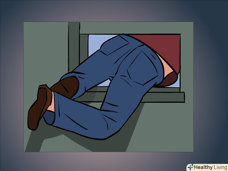 - Не стрибайте з вікна. Перекиньте свій корпус і тримайтеся руками так, щоб тіло звисало. Потім відпустіть руки і зігніть коліна. Можете потренуватися вдома. Пам'ятайте, що потрібно вибратися за 30 секунд і викликати пожежну бригаду, навіть якщо ви думаєте, що її вже викликали. Залишайтеся недалеко від будівлі, поки не приїдуть пожежники, і ви їм не повідомите, що евакуювалися благополучно. Якщо вам потрібна перша медична допомога, попросіть про це пожежну службу. Якщо ви будете з собою брати димозахисний капюшон, у вас збільшаться шанси на виживання, і він може забезпечити вас чистим повітрям до 30 хвилин.