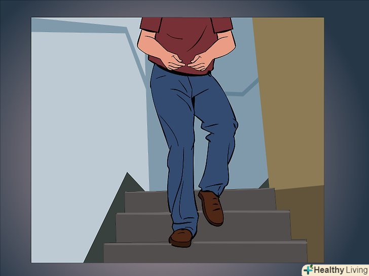 Якщо сходи не заповнені димом, скористайтеся нею, щоб вийти з будівлі. Тримайтеся за поручні, щоб не збитися зі шляху і не впасти. Якщо на сходовому майданчику багато важкого диму, у вас немає вибору, окрім як скористатися іншим виходом або повернутися до себе в номер. Не намагайтеся промчати вперед крізь дим, якщо шлях назад не заблокований. Дим, ймовірно, вкрай токсичний, і ви не знаєте, з чим зіткнетеся внизу.- Якщо вийти неможливо, поверніться в свій номер або попрямуйте до виходу на дах. Якщо, спустившись вниз по сходах, ви побачили, що Вам перегороджує шлях полум'я або важкий дим, ви можете або повернутися в свій номер, або піднятися до виходу на даху, якщо це можливо.