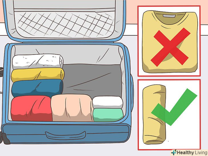 Згорніть свій одяг. якщо ви ще не згортаєте речі в трубочку, навчитеся робити це. Завдяки цьому на речах не буде дивних складок, і ви зможете заощадити місце у валізі. Покладіть більш важкі речі вниз і більш легкі наверх — вони будуть краще пристосовуватися до форми валізи.- Чим щільніше буде скручена одяг, тим більше місця залишиться у валізі. Спробуйте скрутити речі трохи сильніше-цього може бути достатньо.
