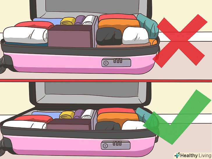 Беріть якомога менше речей. чим менше речей, тим менше вага багажу. Крім того, так ви втратите менше речей (в готелі або під час перельоту). Легкий чемодан простіше переміщати, і у вас залишиться місце для сувенірів і імпульсивних покупок. крім того , вам буде простіше зібрати валізу перед вильотом назад.- Хоча багато взуття брати з собою не варто, хоча б одну запасну пару потрібно скласти. Взуття можна скласти в пластикові пакети, щоб не забруднити інші речі, якщо тільки взуття не нова. Складіть шкарпетки у взуття-це допоможе вам заощадити місце.
