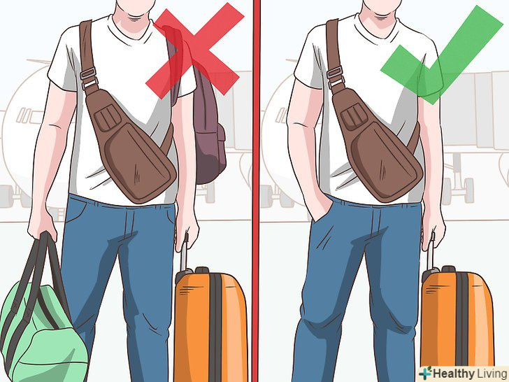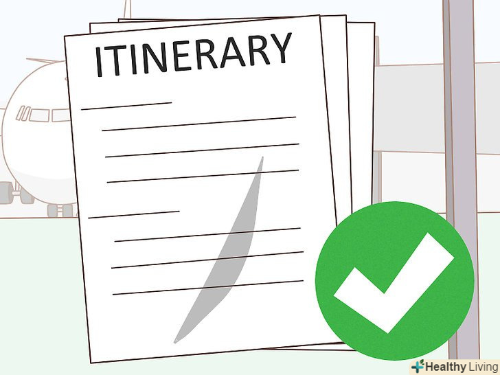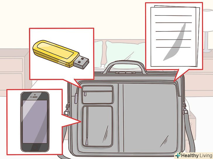 Підготуйте всі документи. щоб потрапити на літак, вам буде потрібно паспорт. Візьміть з собою кредитні карти і документи, які можуть вам знадобитися (водійське посвідчення, страховка). Але не варто брати з собою всі карти, оскільки є ризик втратити їх все відразу.- Тримайте документи, пов'язані з перельотом, в зручній кишені ручної поклажі. Покладіть туди буклет авіалінії, квиток на літак або посадковий талон. Ці документи стануть в нагоді вам, якщо у вас буде можливість скористатися варіантом самостійної реєстрації на рейс в аеропорту.