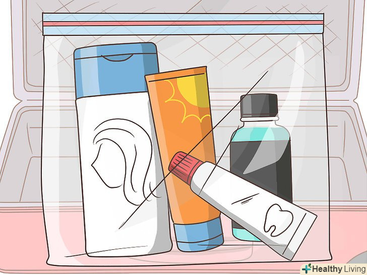 Будьте готові до того, що ємності з косметикою можуть протікати. якщо ви берете з собою косметичні засоби, якісь з них можуть потекти. Загорніть кожну пляшечку окремо і складіть в пакети, щоб косметика не потрапила на одяг. Тримайте всю косметику в окремому місці в багажі.- Зніміть кришку з кожної ємності, натягніть пакет, а потім надіньте кришку назад. Навіть якщо кришка злетить, нічого не трапиться. [4]