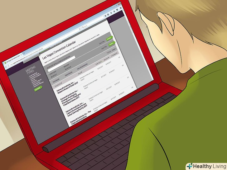 Перевірте, чи не будуть проводитися виставки або конференції під час вашої поїздки. вартість житла і квитків на літак різко виростає в ті числа, коли в Лас-Вегасі проходять важливі виставки або конференції. Зайдіть на сайт http://www.vegasmeansbusiness.com/planning-tools/convention-calendar/ і переконайтеся, що на час вашої поїздки нічого не заплановано. [7]- Якщо в популярному місці (наприклад, в готелі або в конференц-холі) буде проходити будь-який захід, краще летіти в інші числа.