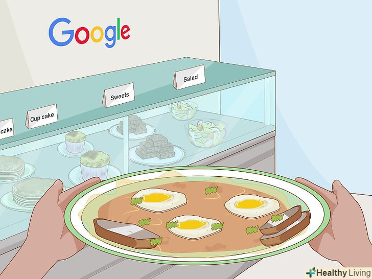 Зайдіть перекусити в один з кафетеріїв. на території Googleplex працюють безліч відмінних кафе і ресторанів, що пропонують широкий вибір страв — від комплексних обідів до високої кухні. Кафетерії та ресторани відкриті для співробітників компанії та їх гостей. Ступінь корисності страв в ресторанах можна оцінити за спеціальними колірними мітками: зеленим, жовтим або червоним. [16]- Зелена мітка означає, що їжа в кафетерії виключно корисна для здоров'я.