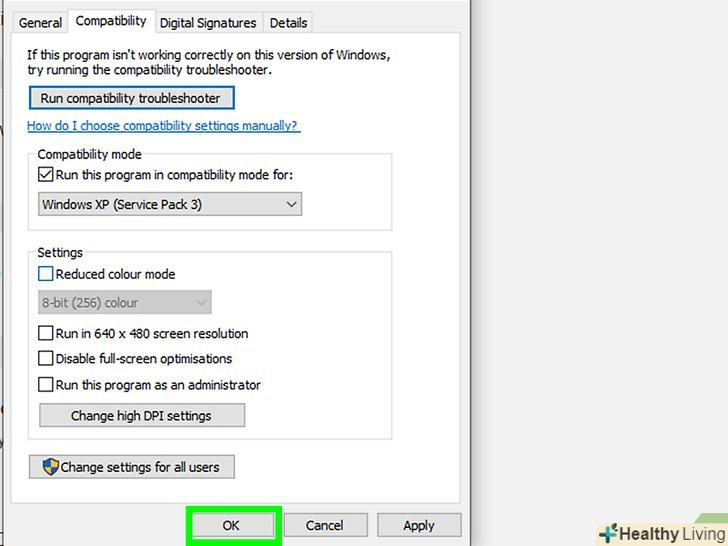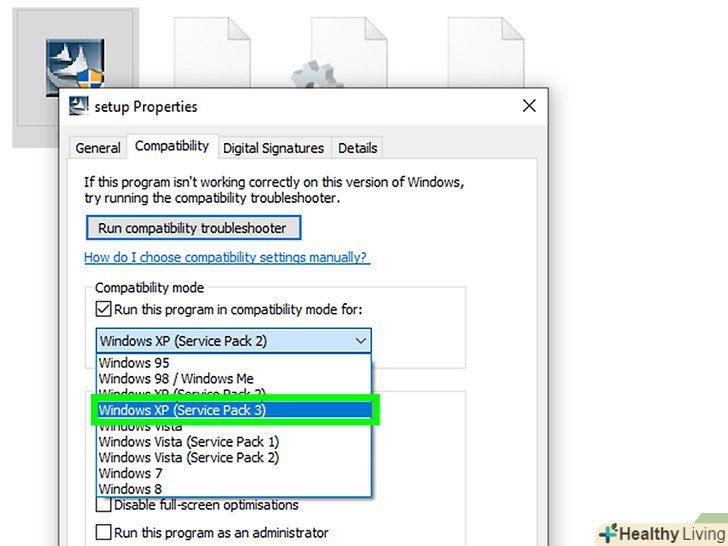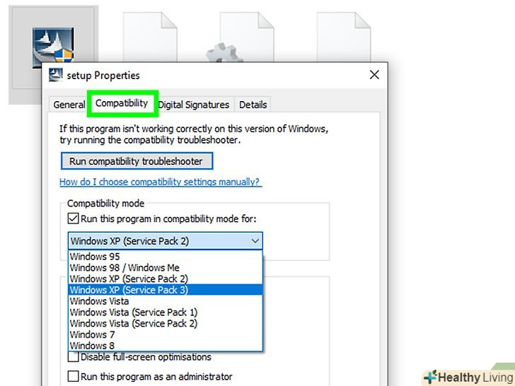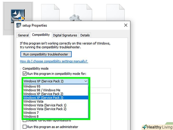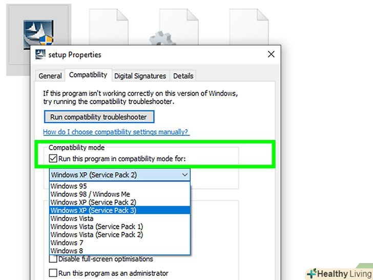 Відкрийте меню під опцією "запустити програму в режимі сумісності з".