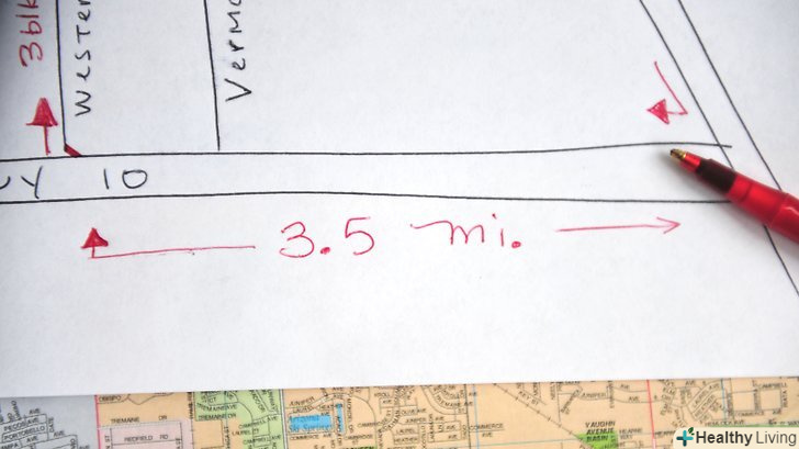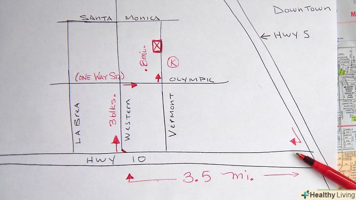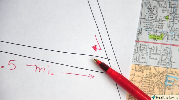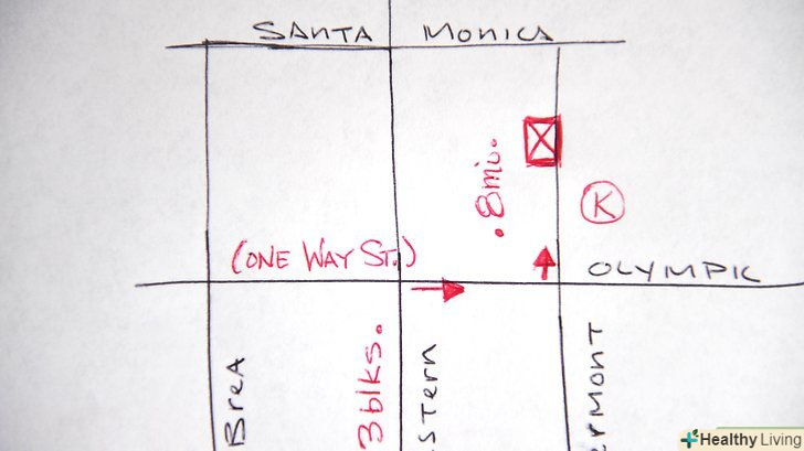 Вкажіть відстань. Як далеко вздовж певної дороги необхідно їхати? Є кілька способів зробити це:- Скільки кварталів або перехресть належить проїхати? Цей спосіб краще працює в центрі великого міста, ніж на його околиці або в сільській місцевості. У місті більше перехресних вулиць, які без праці можна порахувати, а на периферії через занадто велику відстань між ними легко збитися з рахунку, та й деякі проїзди виглядають самостійними дорогами. Наприклад:»продовжуйте рухатися по цій вулиці, минаючи чотири перехрестя".