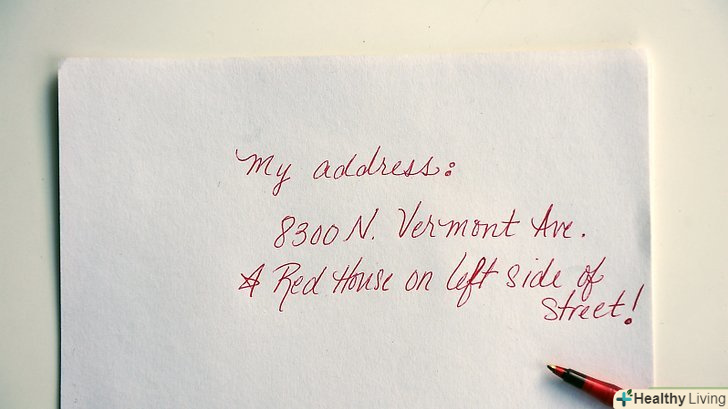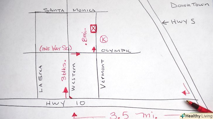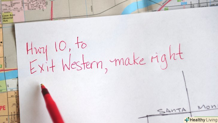 Опишіть весь маршрут. Пам'ятайте, що необхідно бути коротким. Докладні вказівки марні. Якщо ви дасте занадто багато деталей, людина просто заплутається. Наприклад: "Поверніть наліво, на вулицю Леніна, а потім на другому світлофорі – направо. Рухайтеся по цій дорозі, поки не доїдете до шосе, воно повинно бути приблизно в п'яти кілометрах. Продовжуйте їхати по шосе близько трьох хвилин до сьомого за рахунком повороту. Мій будинок-третій зліва. Якщо ви побачите бібліотеку, ви проїхали занадто далеко".