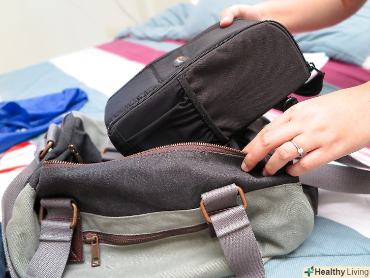 Беріть з собою дорожніх розмірів туалетні приналежності, якими Ви користуєтеся. Авіалінії вводять суворі обмеження на обсяг рідин, який кожен пасажир може взяти з собою на борт. Так що якщо ви подорожуєте з ручною поклажею, краще прикупити "речі без яких ви не можете" дорожніх розмірів. Шампуні, зволожуючі креми, зубні пасти і деяка косметика для макіяжу підпадають під цю категорію речей. Щоб було зручно проносити ці приналежності через контрольний пункт, покладіть їх в пластиковий або герметизируемый пакет.- Будьте уважні, тому що на більшості авіаліній діє правило 3-1-1. Пляшки з рідиною повинні бути 3.4 унції (100 мл), їх загальний обсяг не повинен перевищувати 1 літр, і всі вони повинні бути упаковані в прозорий поліетиленовий мішок об'ємом до літра. [3]